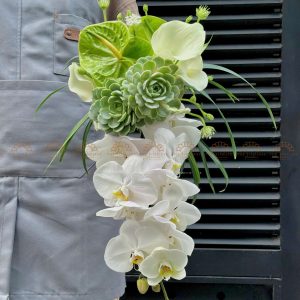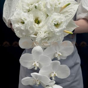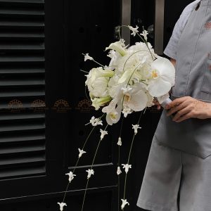 Hoa Cưới Dáng Thác Đổ dài với kiểu dáng hoa cưới thác đổ , phần đuôi rũ dài, nhẹ nhàng chuyển động theo nhịp bước sẽ đem lại một vẻ đẹp dịu dàng, yêu kiều cho các nàng.
