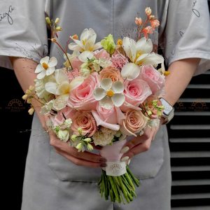 Bó hoa cưới tulip cùng 2 loại hoa hồng và hoa lá phụ H115
