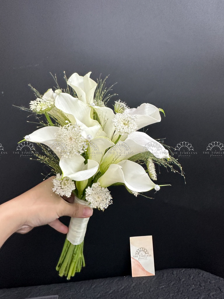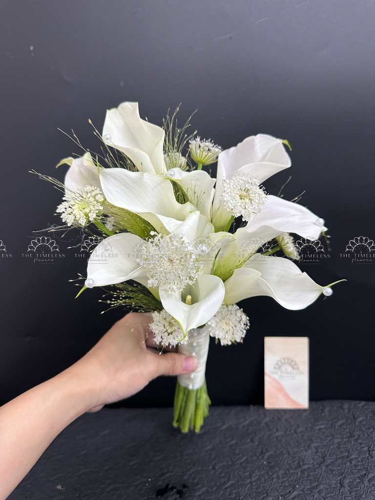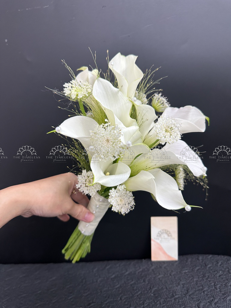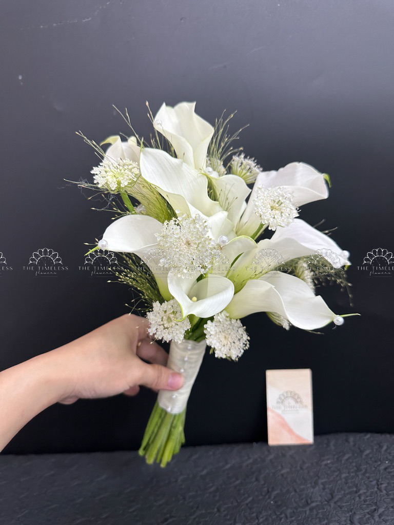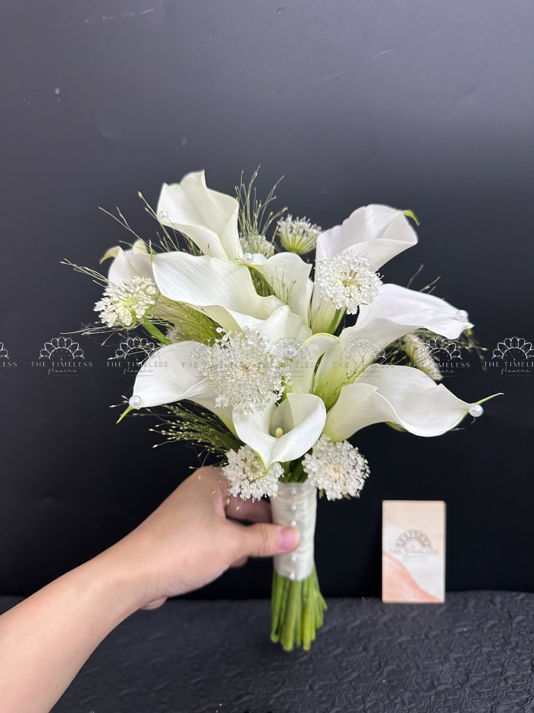 Bó hoa cưới 9 Calla trắng Mix lá Chanh Ý A400