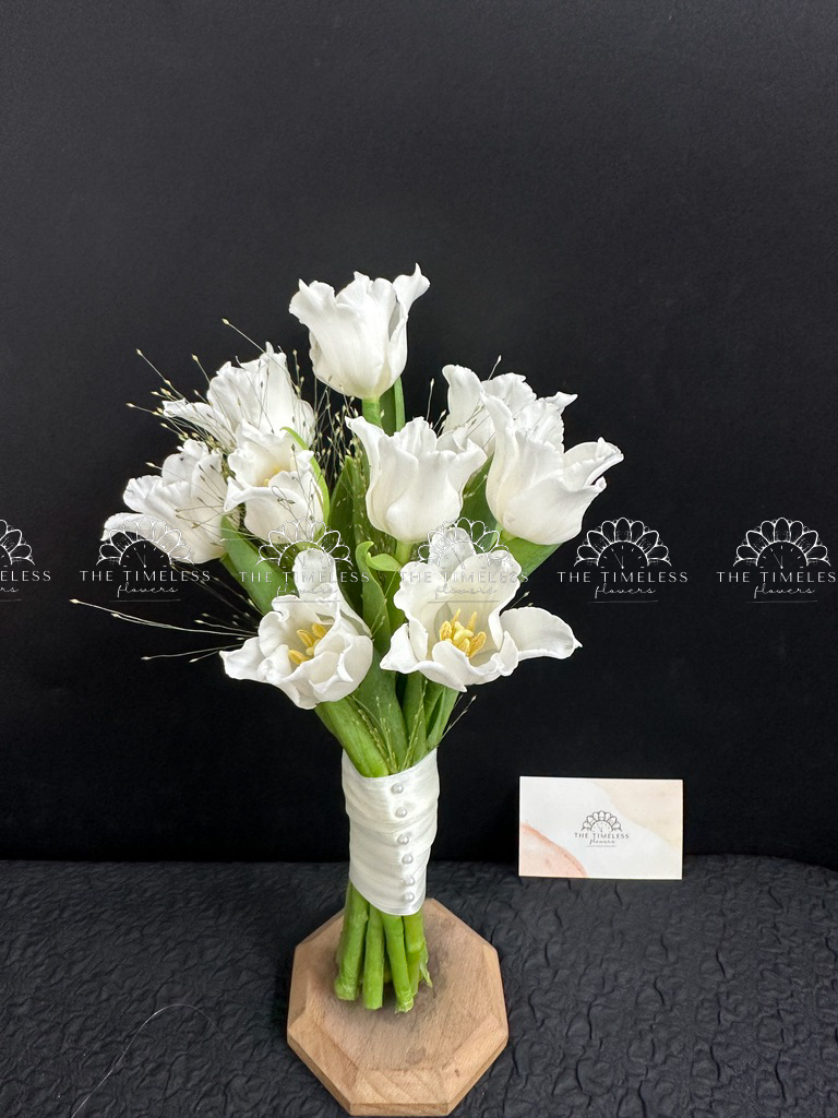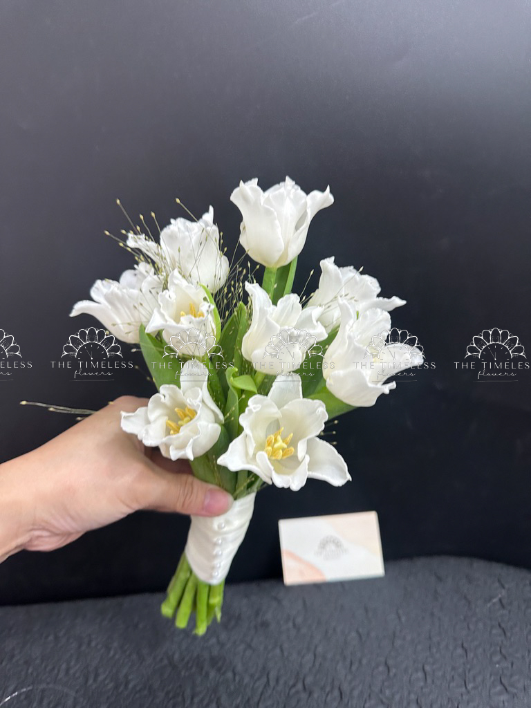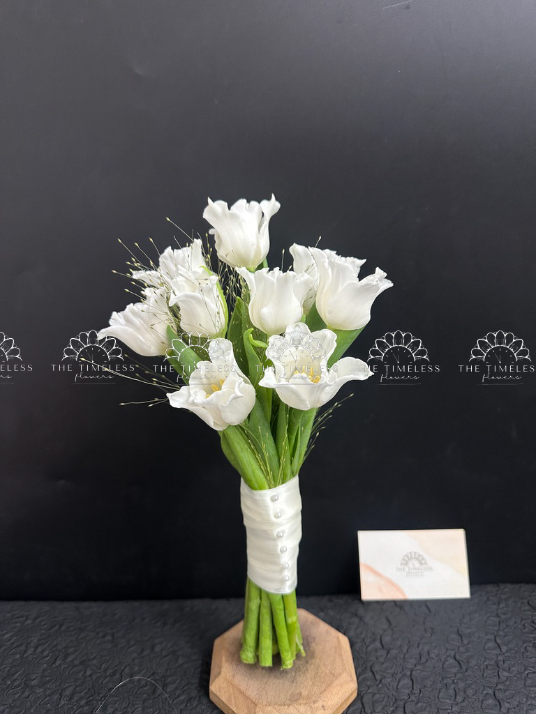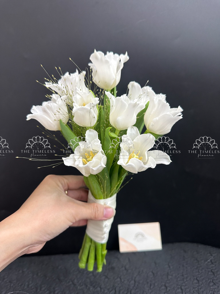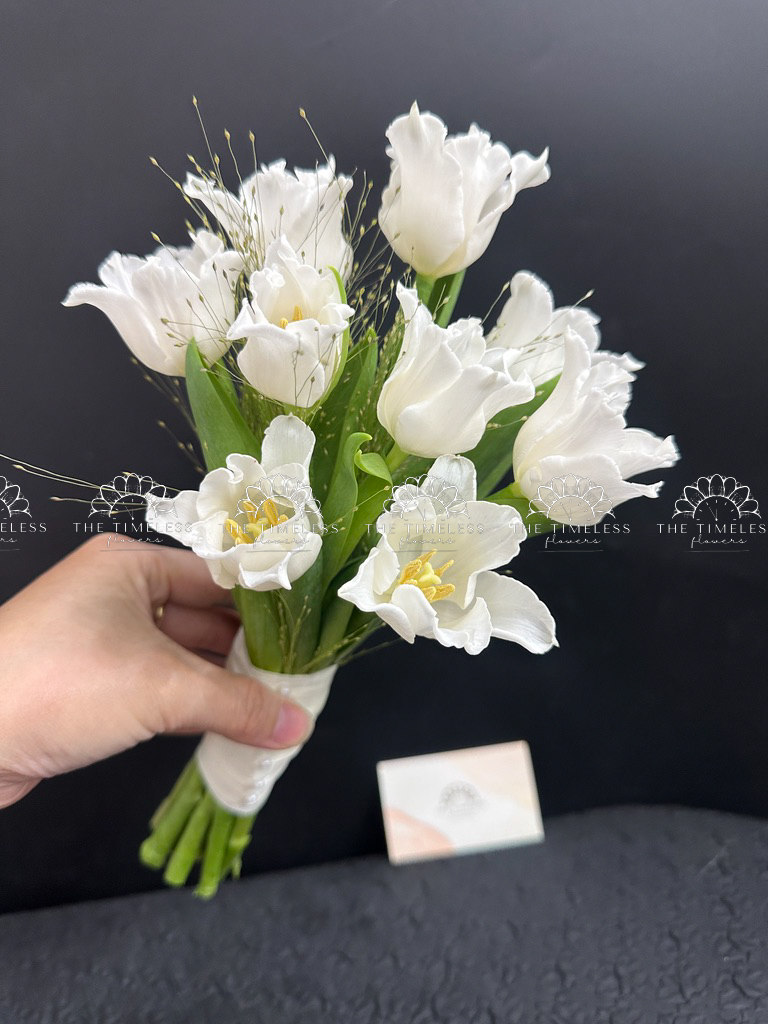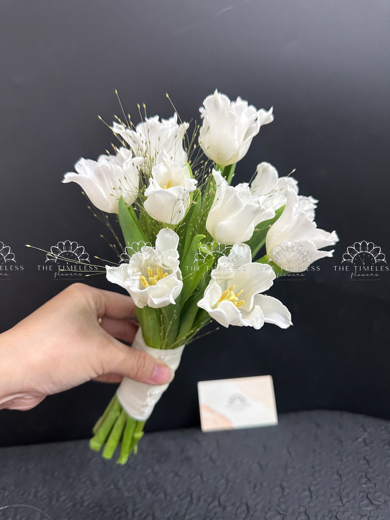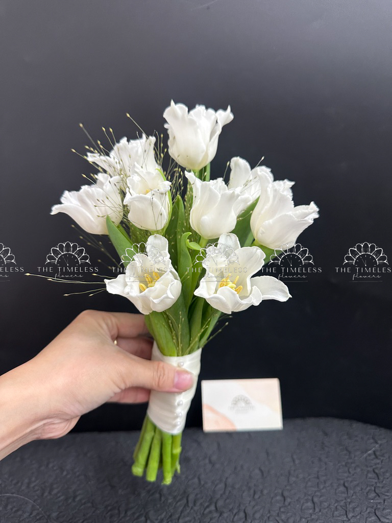 Hoa tulip là một trong những loài hoa yêu thích được sử dụng trong bó hoa cưới. Vẻ thanh lịch, tinh tế mà sang trọng. Nếu Bạn muốn có một bó hoa cưới thanh lịch, hoa cưới tulip trắng chắc chắc là lựa chọn không thể bỏ qua.