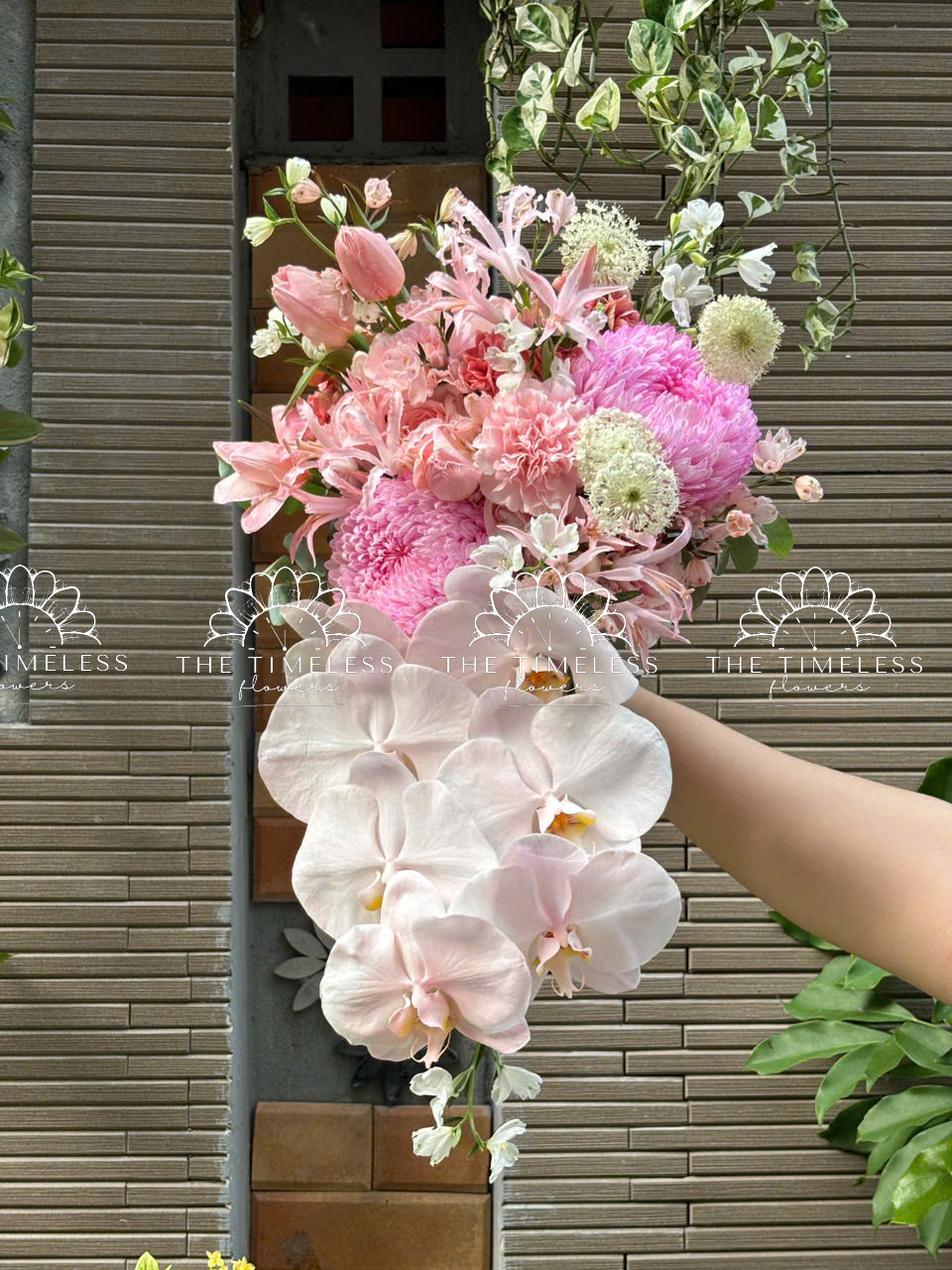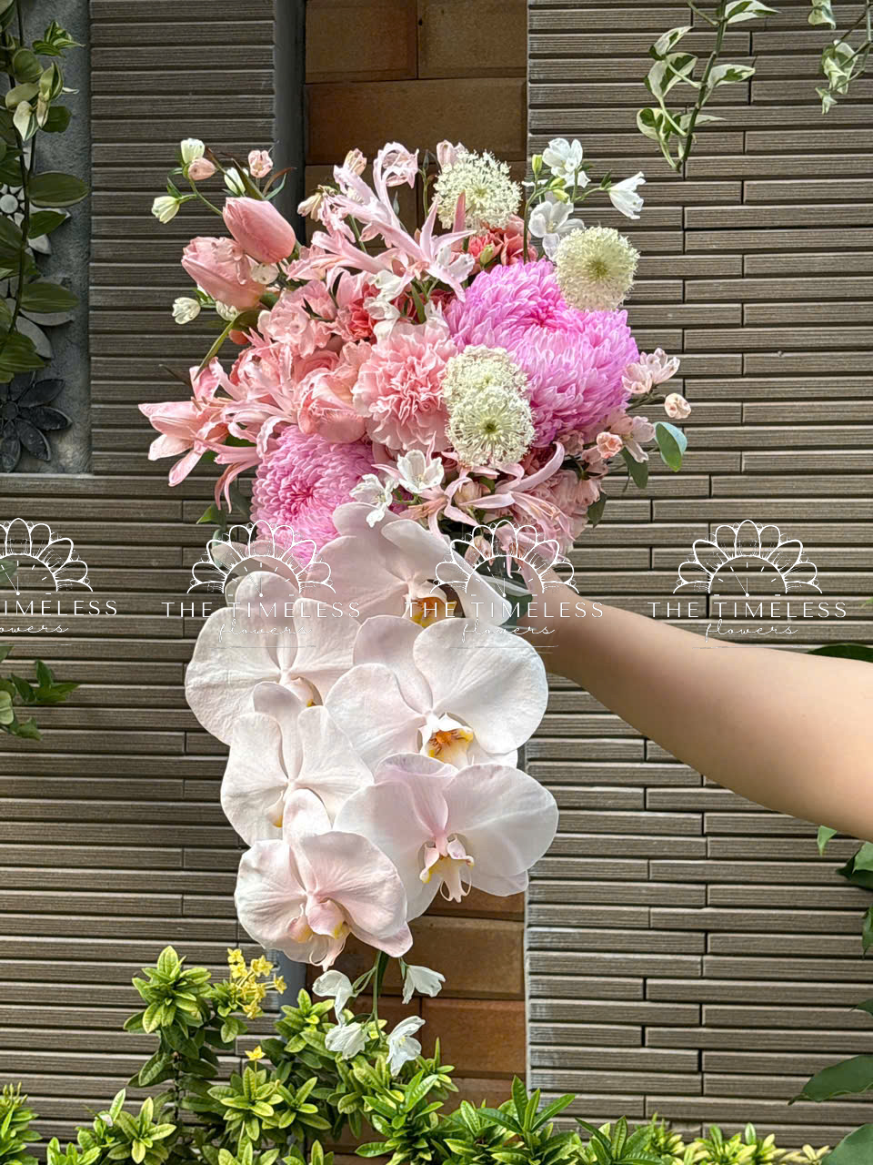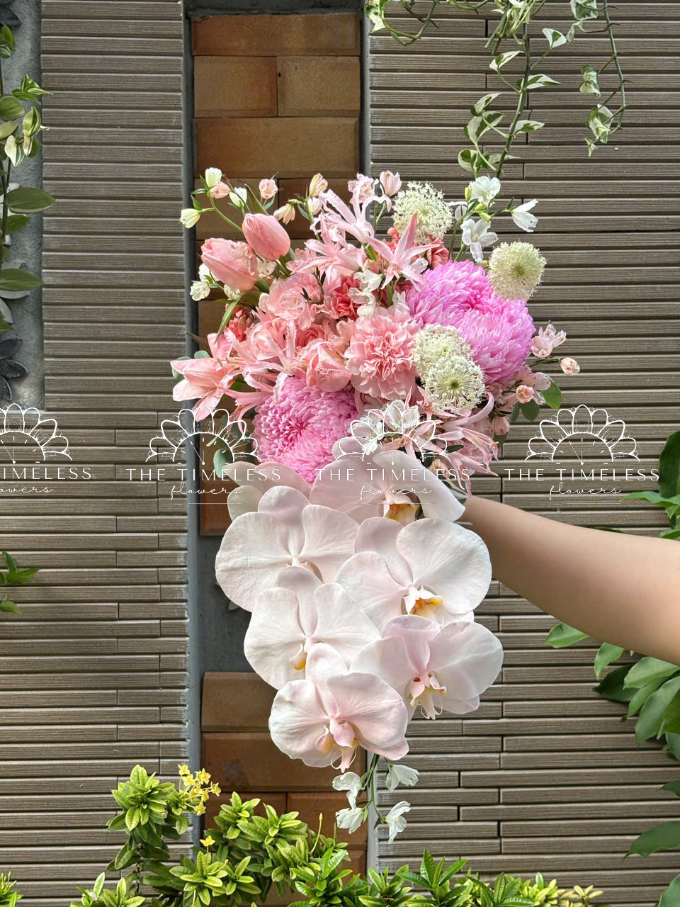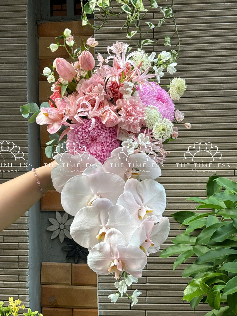 Sản phẩm hoa mẫu chỉ mang tính chất tham khảo. Bởi vì: một số loại hoa trong mẫu theo mùa sẽ không có hoặc chất lượng không đảm bảo, do đó chúng tôi sẽ dùng các loại hoa khác thay thế. Nhưng The Timeless Flowers đảm bảo định lượng, tone màu, kiểu dáng cũng như chất lượng hoa tươi đẹp và đầy đặn nhất. Bạn sẽ nhận được ảnh hoàn thiện trước khi chúng tôi giao hoa.