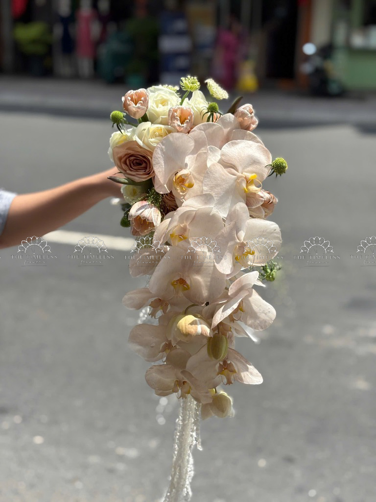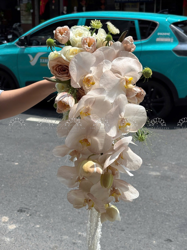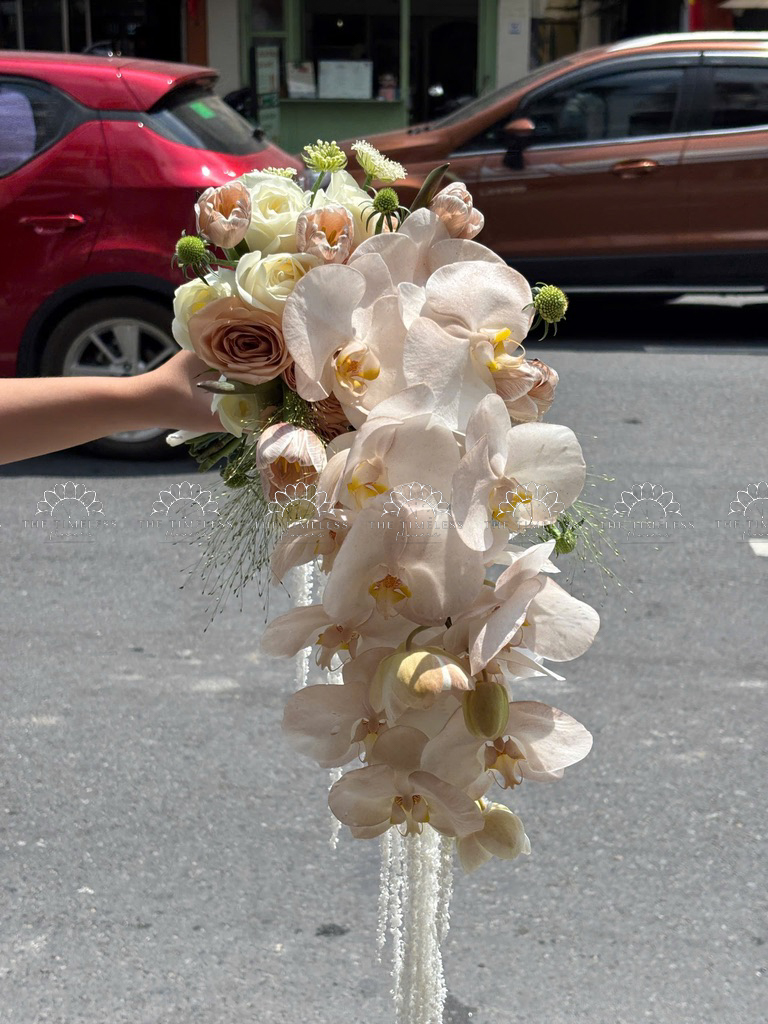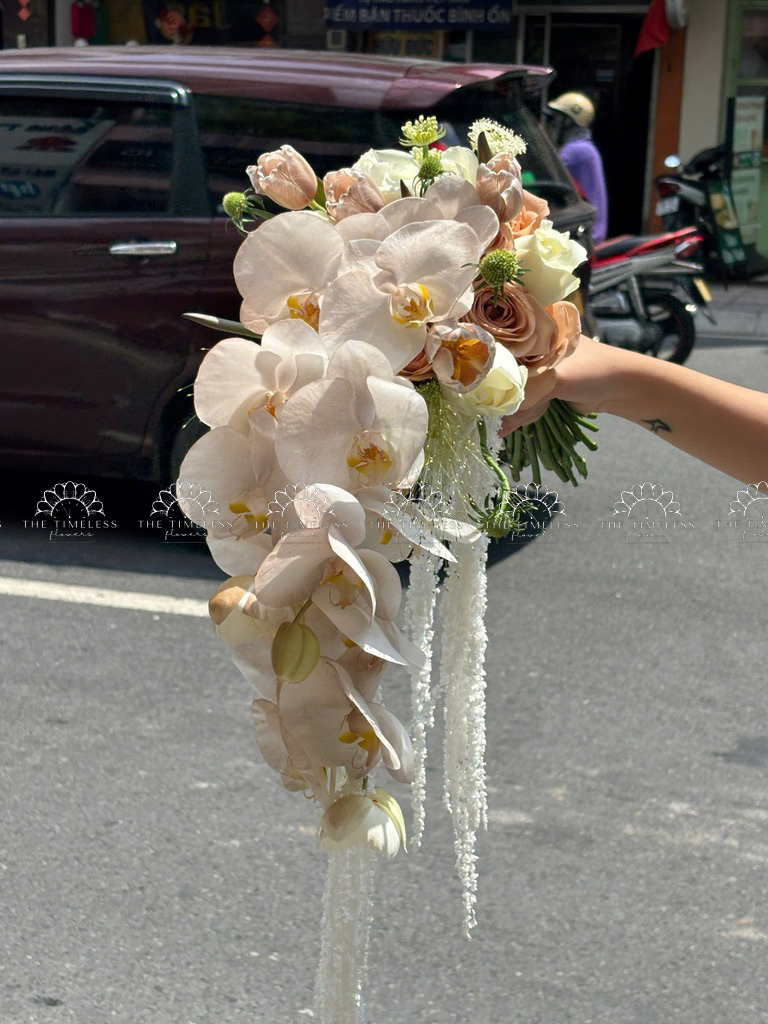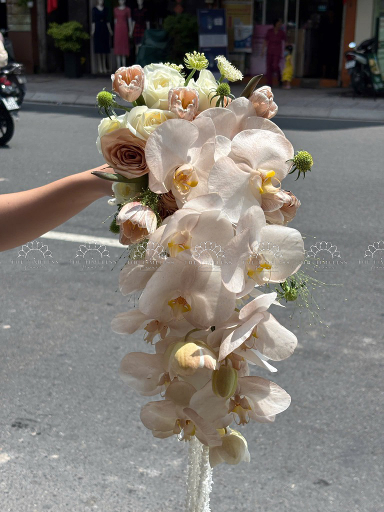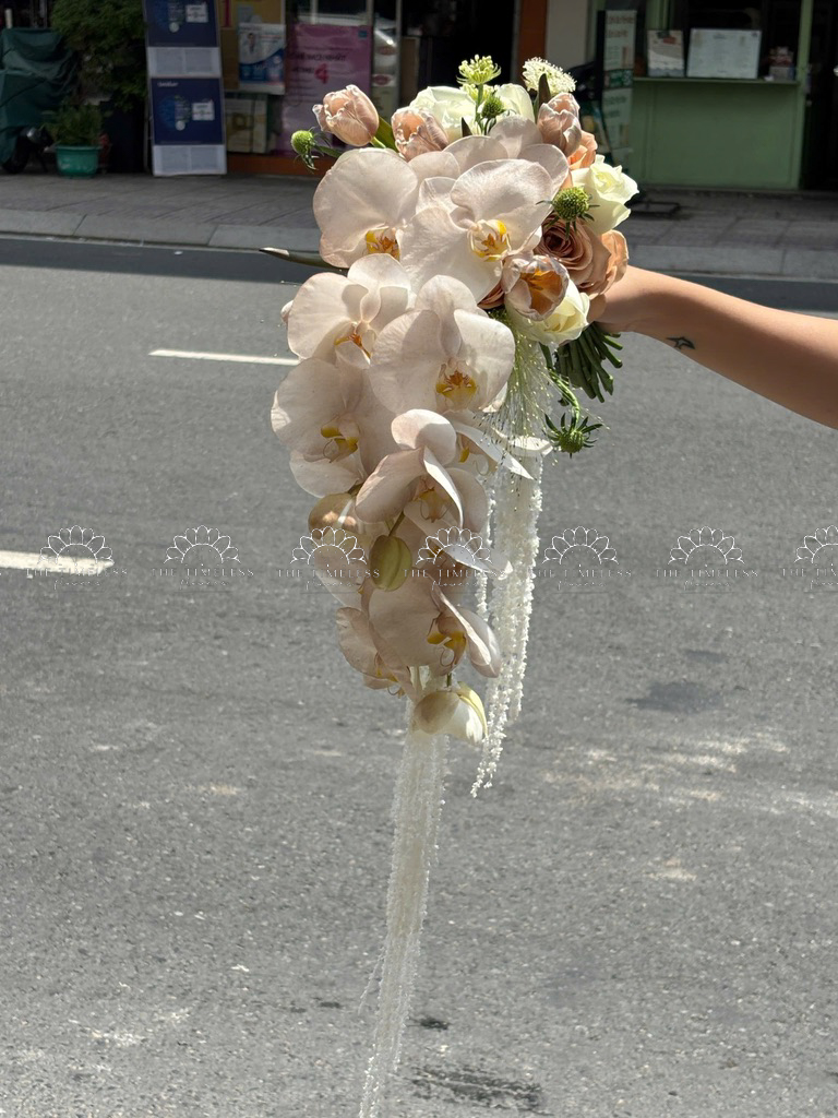 Hoa Cưới Dáng Tháng Đổ Lan Hồ Điệp và Tulip Nâu A438